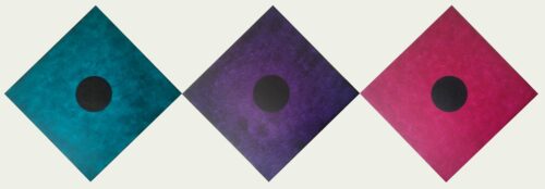 Bindu Art in Green, Purple, and Magenta, Acrylic on Canvas, each 20x20x1.5″